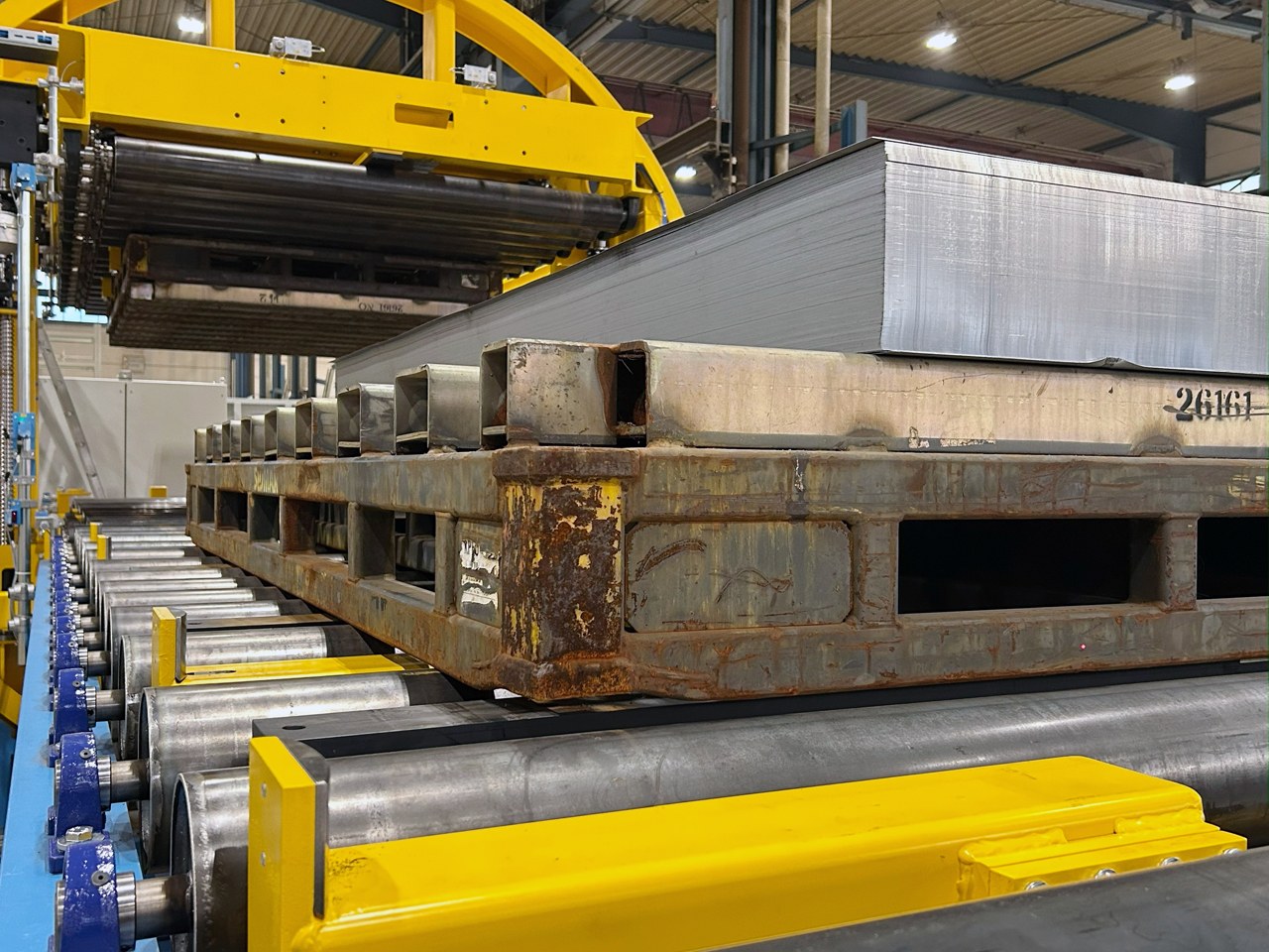 - Die fertig gewendete Palette mit dem Blechstapel (oben aufliegend) wird auf der Einlaufseite "Rechts" ausgefördert und steht dem Bediener auf der Einlaufrollenbahn zur Abholung bereit.
